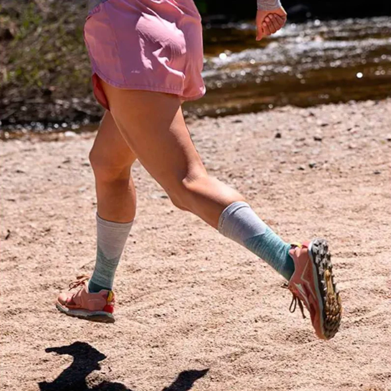 La altura Crew evita la entrada de suciedad y pequeños residuos y las fibras COOLMAX® mantienen los pies secos, mientras que la amortiguación de grosor medio protege frente al impacto. Este calcetín técnico con dedos marca la diferencia para corredoras de trail.