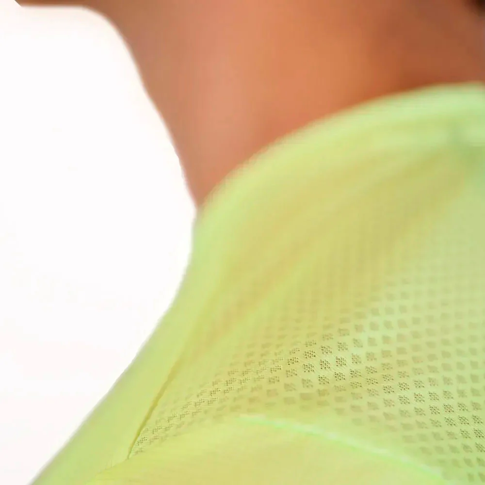 La zona de la espalda y las axilas incorpora tejido de rejilla 100% poliéster (100 g/m²), estratégicamente colocado para mejorar la transpirabilidad y ofrecer mayor confort al usar mochila de hidratación.