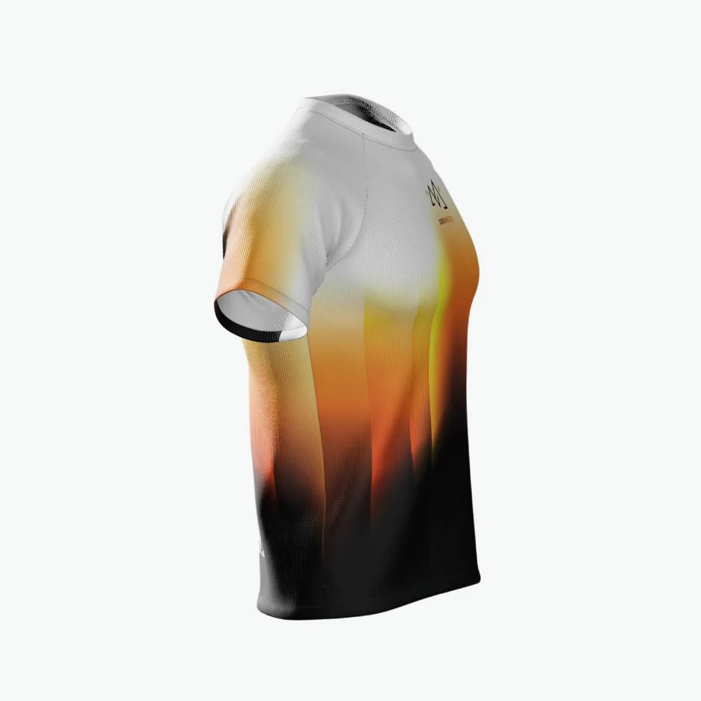 - Toques anaranjados, como los de un buen anochecer en la montaña en el centro de la camiseta, como homenaje también a nuestro pasado en el mundo de la orientación.