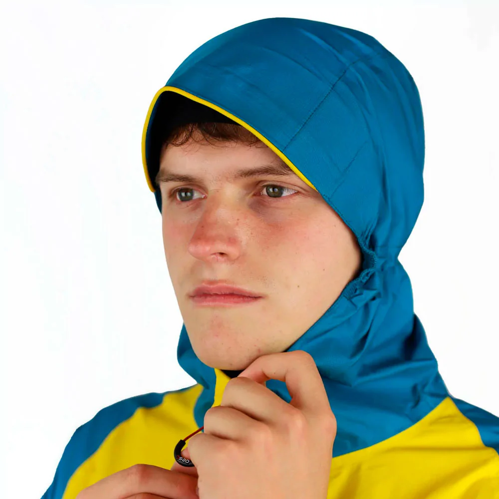 La chaqueta es totalmente cortavientos y cuenta con una capucha ajustable con sistema de fijación de 3 puntos y visera flexible, diseñada para mantener la visión despejada bajo la lluvia. Su diseño permite plegarla en su propio bolsillo, facilitando el transporte y ahorrando espacio en la mochila.
