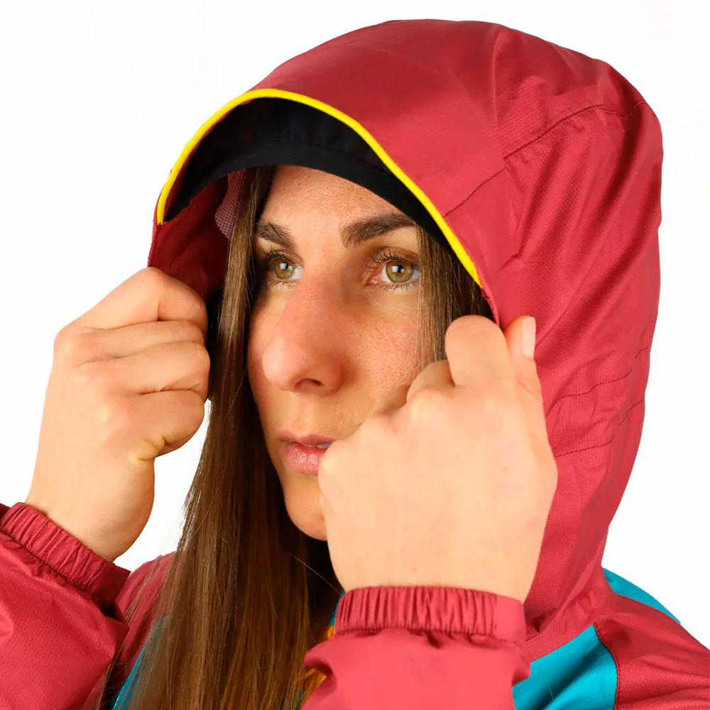 La chaqueta es totalmente cortavientos y cuenta con una capucha ajustable con sistema de fijación de 3 puntos y visera flexible, diseñada para mantener la visión despejada bajo la lluvia. Su diseño permite plegarla en su propio bolsillo, facilitando el transporte y ahorrando espacio en la mochila.