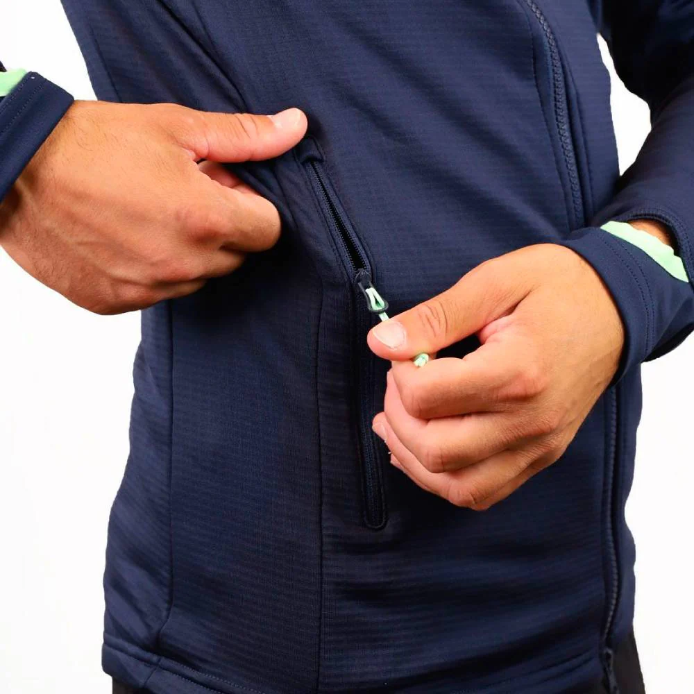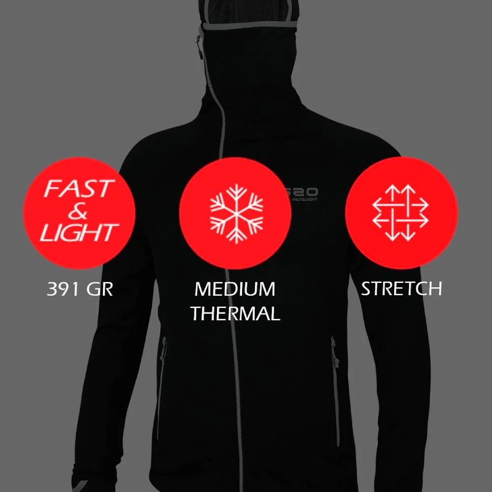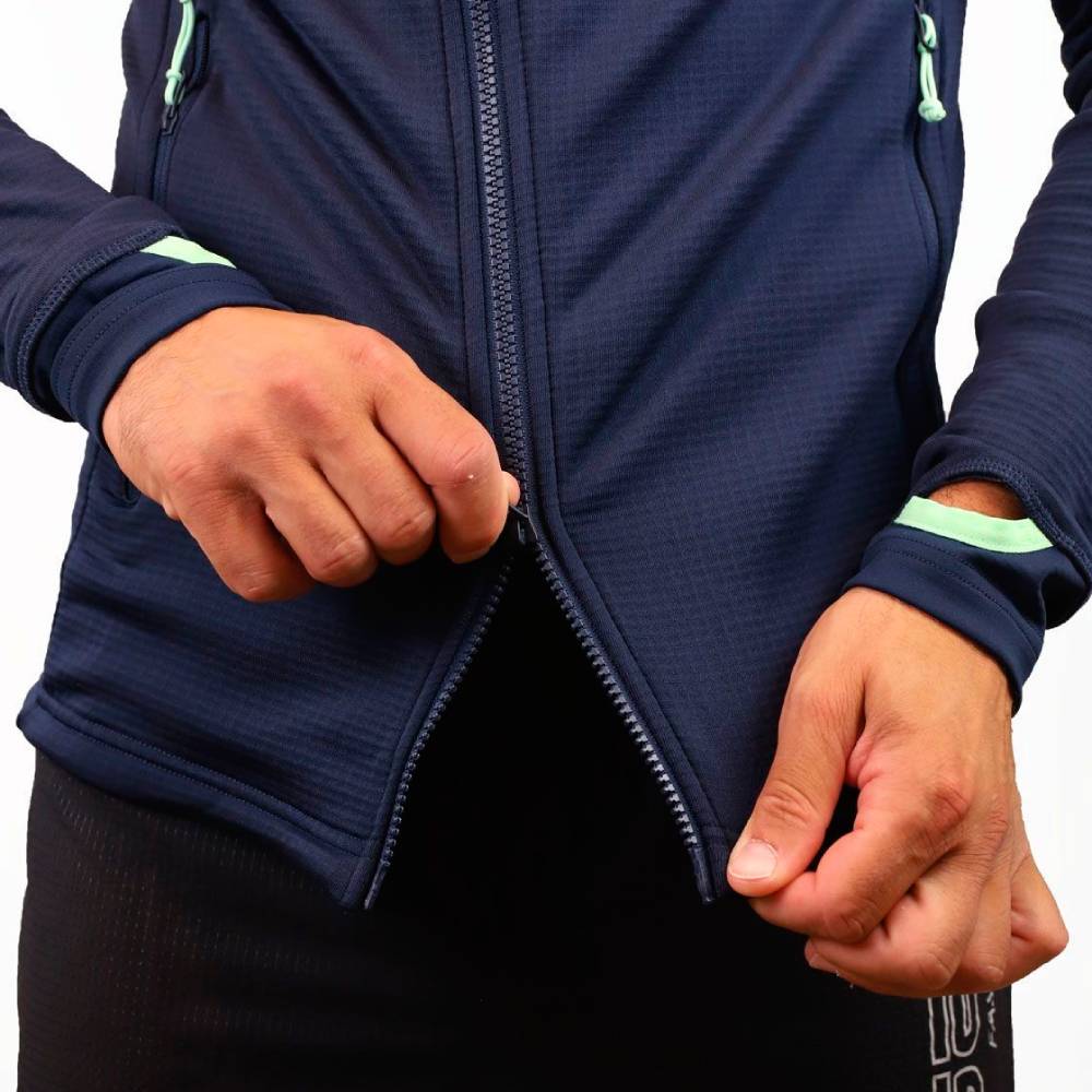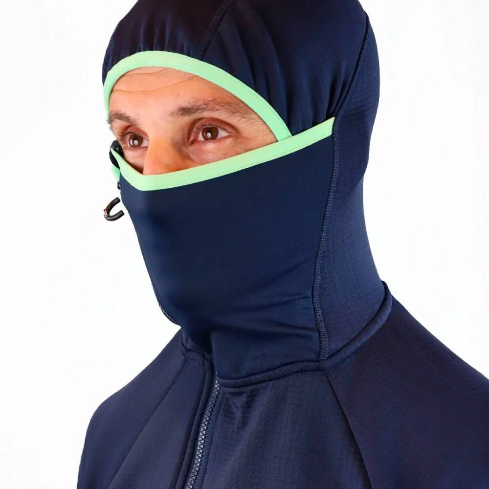 Su alta elasticidad hace que se ajuste al cuerpo a la perfección sin limitar los movimientos. La capucha ha sido milimétricamente diseñada, con un cuello que puede colocarse como máscara para proteger boca y nariz en las condiciones más extremas, y junto con su cremallera asimétrica que se cierra a un lado, evita molestias incluso tras muchas horas de uso. Los puños con agujero para el pulgar permite un ajuste perfecto para mantener protección y calor.