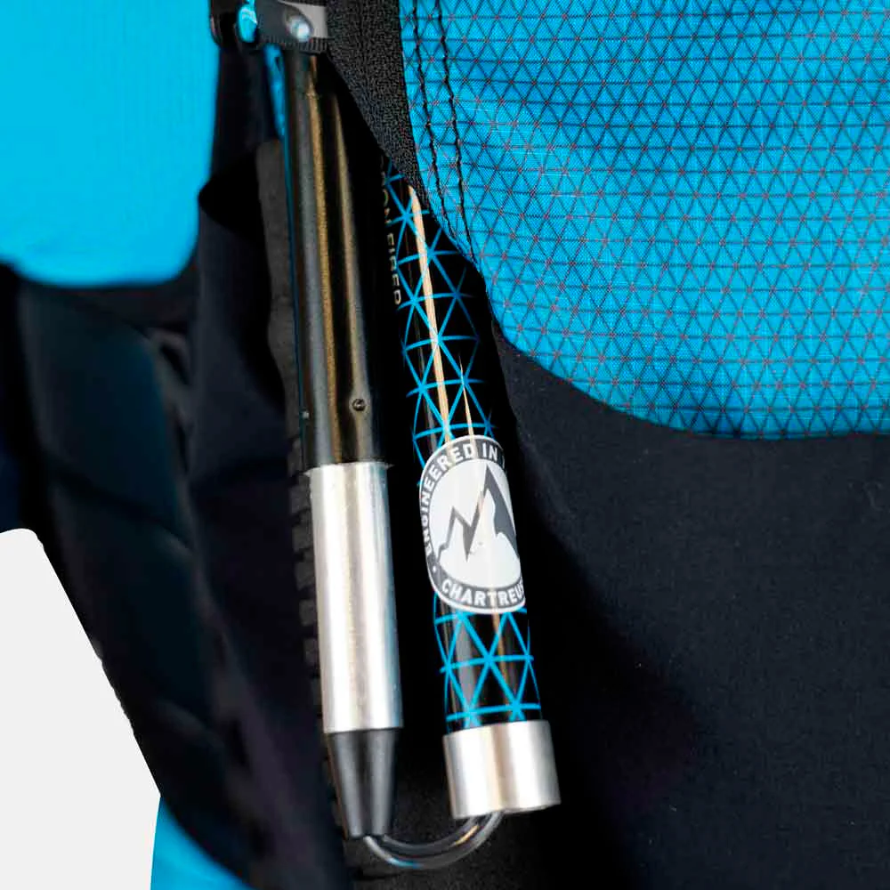 La mochila cuenta con dos sistemas para llevar los bastones. El primero, en la zona delantera, mediante unas gomas que te permiten cruzar los bastones de forma horizontal por encima de los bolsillos de los soft flask, de manera que quedan a lo ancho a la altura del pecho.