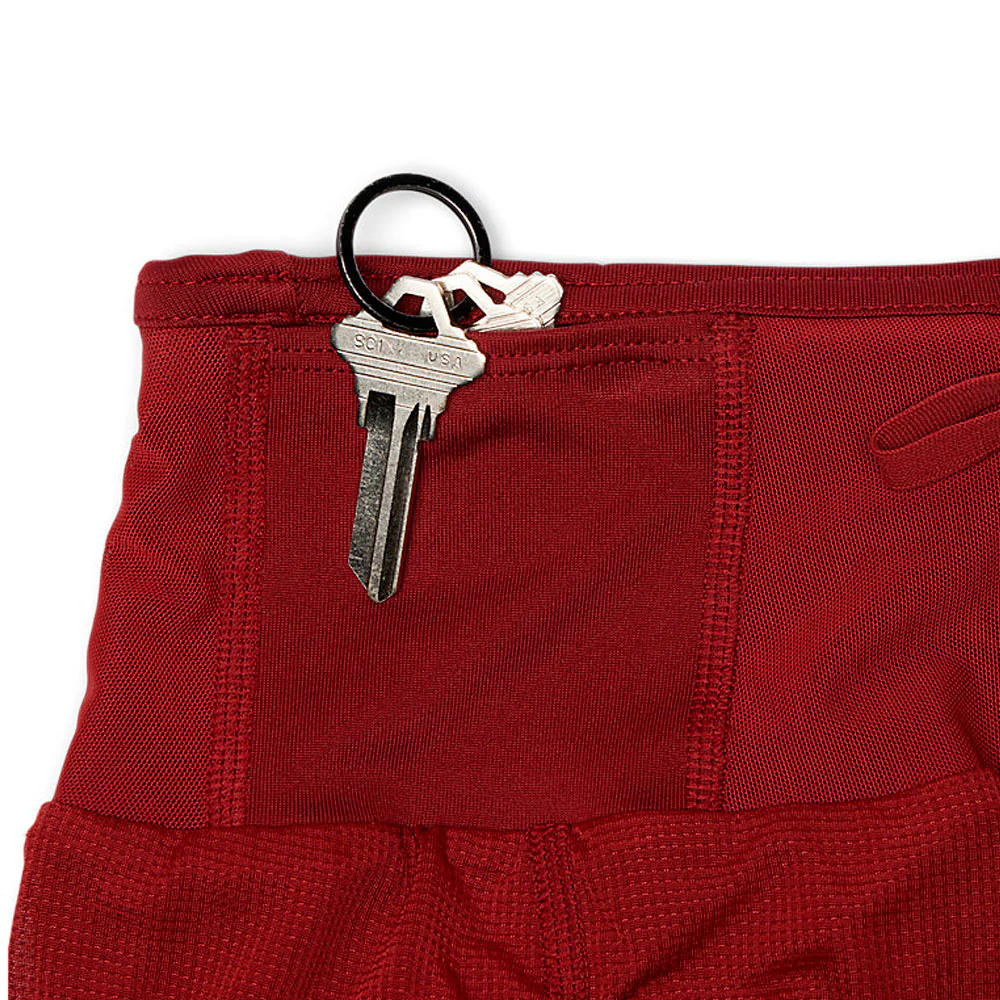 Con bolsillos, uno en la parte posterior para el móvil y dos bolsillos anteriores más pequeños. El pantalón tiene un sistema de tira elástica para guardar una chaqueta, una camiseta o cualquier objeto necesario para correr.